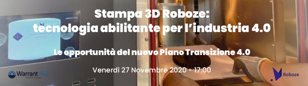 WebinarStampa 3D Roboze: tecnologia abilitante per l’industria 4.0 – Le opportunità del nuovo Piano Transizione 4.027 Nov 2020 (16:00)27 Nov 2020 (17:00)