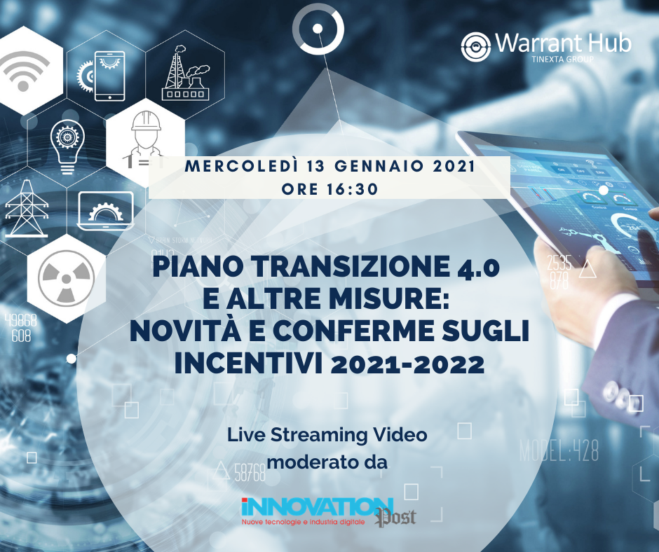 WebinarPiano Transizione 4.0 e altre misure: novità e conferme sugli incentivi 2021-202213 Gen 2021 (15:30)13 Gen 2021 (17:00)
