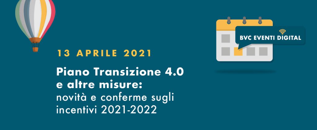 WebinarPiano Transizione 4.0 e altre misure: novità e conferme sugli incentivi 2021-202213 Apr 2021 (15:00)13 Apr 2021 (15:00)