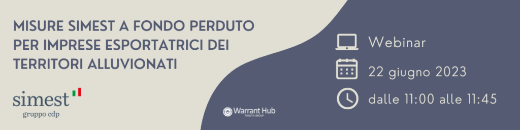 WebinarMisure Simest a fondo perduto per imprese esportatrici dei territori alluvionati22 Giu 2023 (09:00)22 Giu 2023 (09:45)