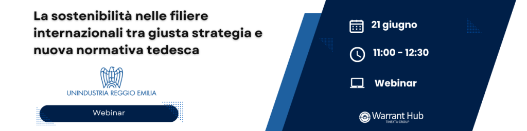 WebinarLa sostenibilità nelle filiere internazionali tra giusta strategia e nuova normativa tedesca21 Giu 2023 (09:00)21 Giu 2023 (10:30)