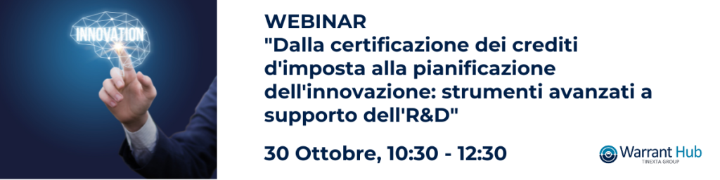 WebinarDalla certificazione dei crediti d’imposta alla pianificazione dell’innovazione: strumenti avanzati a supporto dell’R&D30 Ott 2024 (09:30)30 Ott 2024 (11:30)