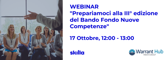 WebinarWebinar Prepariamoci alla III° edizione del Bando Fondo Nuove Competenze17 Ott 2024 (10:00)17 Ott 2024 (11:00)