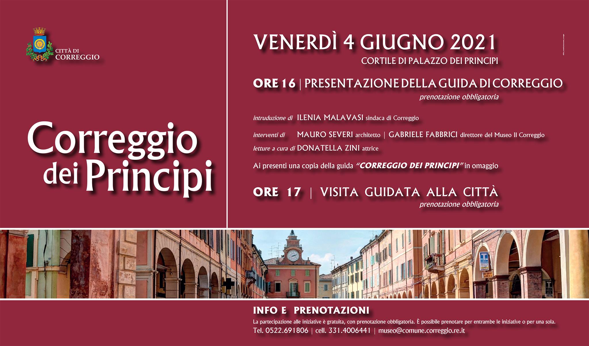 Venerdì 4 giugno – ore 16, cortile di Palazzo dei Principi – presentazione di “Correggio dei Principi”, la guida della città di Correggio. Dopo l’introduzione del sindaco, Ilenia Malavasi, la presentazione vedrà gli interventi dell’architetto Mauro Severi e di Gabriele Fabbrici, direttore del Museo Il Correggio, oltre alle letture a cura dell’attrice Donatella Zini. A seguire, alle ore 17, visita guidata alla città. La partecipazione alle iniziative è gratuita, con prenotazione obbligatoria: è possibile prenotare per entrambe le iniziative o per una sola telefonando ai numeri 0522.691806 e 331.4006441 o scrivendo a [email protected] Ai partecipanti alla presentazione, sarà distribuita in omaggio una copia della guida. Warrant Hub ha sostenuto, come per l’edizione precedente, la pubblicazione della guida e partecipa all’evento con una propria delegazione.