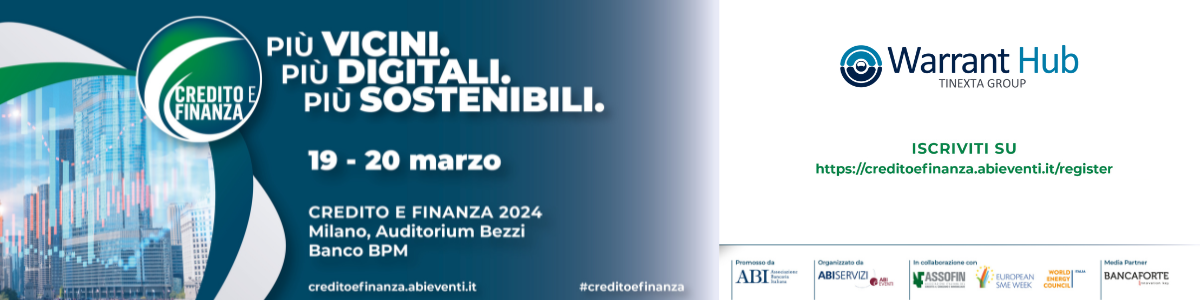 Credito e Finanza è l’appuntamento promosso da ABI dedicato al Credito a Famiglie e Imprese e al Mercato dei Capitali. L’evento si svolgerà a Milano il 19 e 20 marzo presso l’ Auditorium Bezzi Banco BPM. Per gli Associati ABI e Assofin e per gli Associati WEC Italia la partecipazione è gratuita. Warrant Hub partecipa al panel A1 del 19 marzo dal titolo “Investimenti, sostenibilità e digitalizzazione: le novità del pnrr” con Patrick Beriotto , Direttore Marketing e Comunicazione Warrant Hub (Tinexta Group). L’evento invita a far riflettere sul ruolo fondamentale degli strumenti di credito e finanza per sostenere lo sviluppo e accelerare il necessario percorso di modernizzazione che il sistema Paese sta compiendo, in un contesto caratterizzato da incertezze geopolitiche, nuove regolamentazioni, innovazioni tecnologiche, spinte alla transizione ESG e alla crescita patrimoniale delle PMI, evoluzione delle esigenze e dei comportamenti di consumatori e imprese. Dopo un intervento di taglio accademico che delineerà lo scenario macroeconomico e i principali trend attesi, la Plenaria d’Apertura proseguirà con due tavole rotonde plenarie moderate da un giornalista. La prima tavola rotonda dedicata alle imprese sarà incentrata sul rapporto di partnership tra banche e PMI e su come le banche siano a fianco delle imprese italiane per aiutarle a finanziarsi sia attraverso il credito che attraverso la raccolta sul mercato dei capitali per sostenere il loro sviluppo sul mercato italiano e internazionale. La seconda tavola rotonda sarà invece dedicata al credito alle famiglie e ragionerà di come sostenibilità, efficienza energetica e innovazione digitale siano le parole d’ordine che guidano le nuove abitudini dei consumatori e ispirano l’innovazione di strumenti, modelli e strategie di business delle imprese finanziarie. Credito e Finanza è inserito nella Settimana europea delle PMI promossa dalla Commissione Europea e il filone dedicato al Credito alle Famiglie è realizzato in collaborazione con Assofin. I temi chiave: Novità legislative e regolamentari Sostenibilità e transizione ecologica Digitalizzazione e innovazioni tecnologiche Distribuzione Fondi ed incentivi europei e nazionali Garanzie pubbliche e private Valutazione, monitoraggio e gestione del rischio NPLs Management e Recupero crediti Finanziamento delle PMI sul mercato dei capitali Rilancio della Capital Markets Union Cartolarizzazione Strumenti finanziari sostenibili e digitali Credito e Finanza si rivolge a Banche, Società finanziarie e di Credito al consumo, Assicurazioni, Imprese, Confidi, Associazioni di imprese e dei consumatori, Società di Asset Management, Investitori istituzionali. In particolare gli esperti delle aree: – Credito – Finanza – Investment Banking – Capital Markets – Funding – Risk management – Sostenibilità – Commerciale – Marketing – Distribuzione – Digitalizzazione e tecnologie Scopri il programma completo a questo link: https://creditoefinanza.abieventi.it/programma-2024 iscriviti