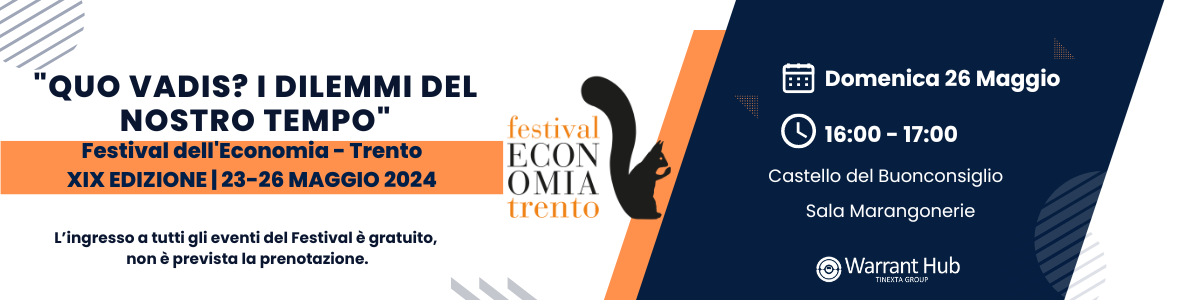 Il tema scelto per questa diciannovesima edizione del Festival dell’Economia di Trento, si inserisce nel solco di un impegno rivolto ad analizzare le sfide dettate da uno scenario mondiale incerto e complesso, proponendo soluzioni e chiavi di lettura . Come affrontare la sfida dei cambiamenti climatici ? Lo sviluppo economico vincerà la partita contro la stretta necessaria a battere l’ inflazione ? Il debito pubblico elevato finirà per destabilizzare l’autorità degli Stati? La transizione energetica è realizzabile nei tempi stretti dettati dall’Occidente? L’inverno demografico finirà per travolgere i sistemi di welfare? Populismi e democrazie sono conciliabili? Sono alcune delle grandi questioni del nostro tempo che il Festival dell’Economia di Trento proverà ad affrontare con alcune tra le menti più brillanti del mondo economico, accademico e politico a livello nazionale ed internazionale. Tinexta Group , per il terzo anno consecutivo, supporta l’iniziativa. Warrant Hub partecipa al Festival rappresentata da Maurizio Fieschi , CEO della società controllata Studio Fieschi e soci, che interverrà in qualità di relatore durante il panel dal titolo “ Sostenibilità e imprese ” , previsto per domenica 26 maggio alle ore 16:00 presso il Castello del Buonconsiglio – Sala Marangonerie. L’ingresso a tutti gli eventi del Festival è gratuito fino ad esaurimento posti, non è prevista la prenotazione. Registrandosi al sito si potranno seguire tutte le dirette streaming e visualizzare i video on demand del Festival.