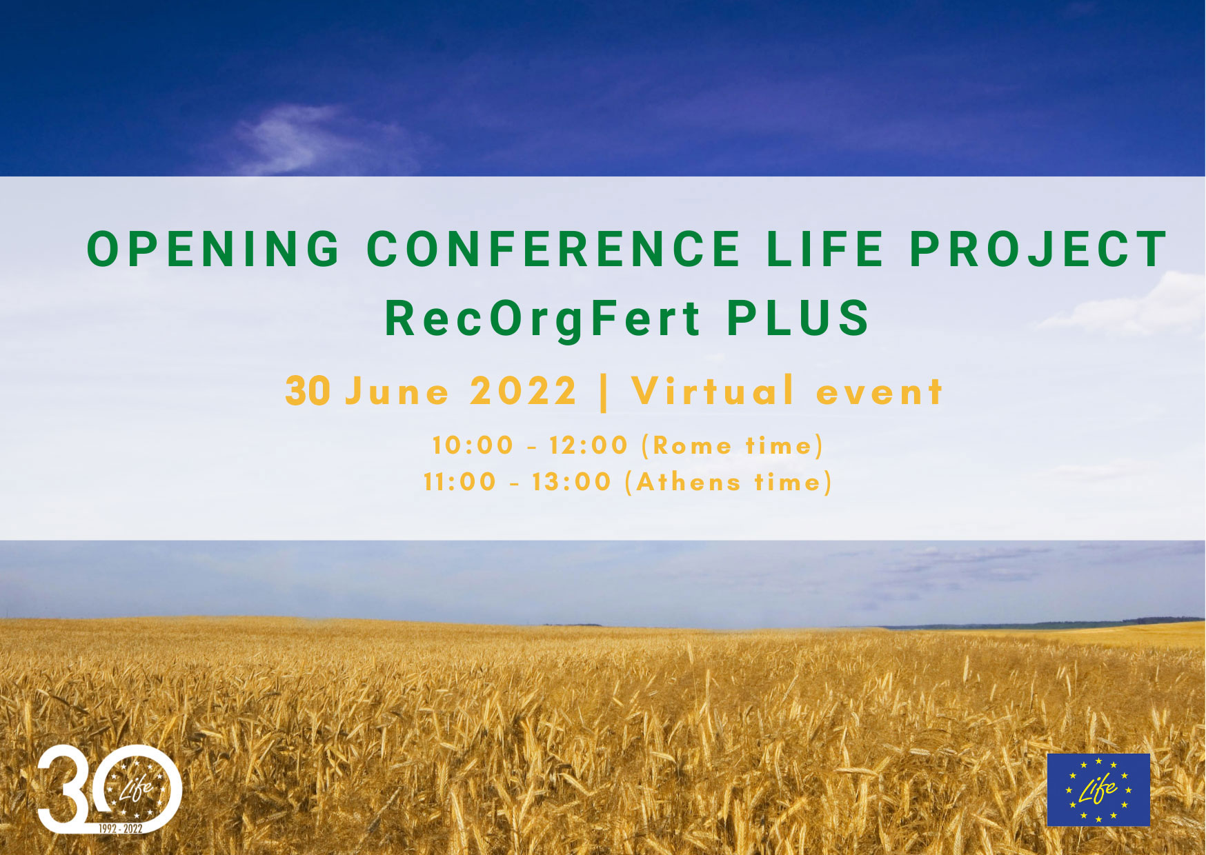 L’Opening Conference del progetto LIFE RecOrgFertPLUS è stata fissata per il 30 giugno alle ore 10 e si terrà online. L’evento è organizzato AFARM, partner del progetto LIFE RecOrgFert PLUS. Warrant Hub partecipa con Massimo Rinaldi , European Funding Development Business Development Manager , in qualità qualità di esperto dei progetti LIFE con una presentazione dal titolo “The LIFE Programme 2022: an opportunity for a Greener Europe”. iscriviti all’evento gratuitamente PROGRAMMA DELL’EVENTO 10:00 – 10:05 > Opening | Evangelos Vergos (AFARM) 10:05 – 10:20 > The LIFE Programme 2022: an opportunity for a Greener Europe | Massimo Rinaldi – BSc, Materials Engineering Business Development Manager (Warrant Hub S.p.A. – Italy) 10:20 – 10:40 > Using agriculture wastes and sulfur as fertilizer for productive purpose Adele Muscolo – Full Professor at Agriculture Department, Mediterranea (University, Reggio Calabria – Italy) 10:40 – 11:00 > LIFE RecOrgFert PLUS Project: goals and business opportunities | Antonio Scialletti – Dr. Eng. – MBA Project Leader of LIFE RecOrgFert PLUS Project Steel Belt Systems (SBS) – Italy 11:00 – 11:15 > Increasing soil organic matter and soil quality with organic fertilizers | Christos Vasilikiotis – M.Sc, Ph.D. Associate Professor, Chair of. Sustainable Agriculture and Management Department (Perrotis College – Greece) 11:15 – 11:30 > The role of biostimulants in plant health and nutrition | Athanasios Gertsis – M.Sc., Ph.D. Professor, Chair of MSc program in Sustainable Agriculture and Management and Director (Krinos Olive Center – Greece) 11:30 – 11:55 > Open discussion 11:55 – 12:00 > Closing remarks | Evangelos Vergos (AFARM)