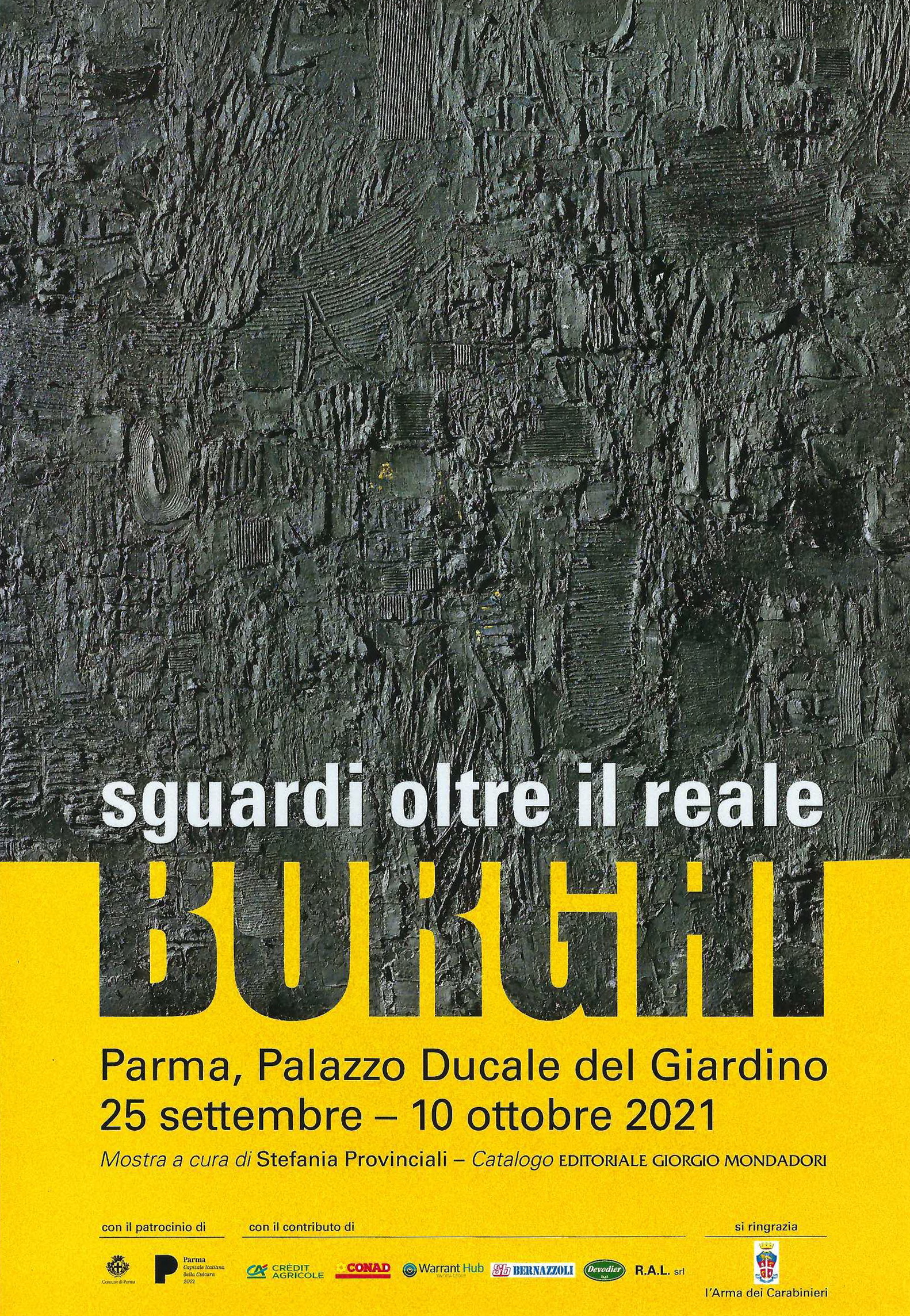 Apre al pubblico sabato, 25 settembre, nel Palazzo Ducale del Giardino di Parma la mostra di Alfonso Borghi “Sguardi oltre il reale”, nell’ambito delle iniziative di Parma Capitale Italiana della Cultura 2020+21, con il patrocinio del Comune di Parma e il supporto di Warrant Hub oltre a Crédit Agricole, Conad, Centro Nord, Bernazzoli, Devodier, R.A.L. srl. Mostra e catalogo ( Editoriale Giorgio Mondadori) sono a cura di Stefania Provinciali. Un’occasione eccezionale per poter ammirare le opere del Maestro di Campegine (Reggio Emilia) appositamente realizzate e i prestigiosi affreschi che ornano le sale del piano nobile del Palazzo, solitamente chiusi al pubblico, dove il percorso espositivo è allestito grazie all’ospitalità del Comando Provinciale dei Carabinieri. “Un luogo ideale – afferma- per dar voce artisticamente all’emozione del mio ritorno a Parma dopo l’ultima esposizione, dieci anni fa, dedicata ad Attilio Bertolucci e alla sua poesia che avevo tenuto a Palazzo Pigorini; la memoria è andata alle parole dell’amico Giuseppe Amadei che mi diceva “Le percezioni dell’artista sono infinitamente più preziose che le descrizioni più fedeli della realtà”. Ecco nel realizzare queste opere mi sono ricordato di quanto mi diceva”. Qui a Palazzo Ducale i dipinti di Alfonso Borghi trovano ideale collocazione, espressione di emozioni, luoghi, idee, suggestioni poetiche. Ci sono nelle opere i colori forti, mescolati a materia e materiali, le sovrapposizioni fatte per strati, le trame sommerse che diventano racconto visivo, in un percorso che trova ampi riferimenti nella ricerca dell’artista che a partire dagli anni settanta del Novecento ha rinnovato nel tempo i legami con la propria storia pittorica, trovando nuovi, infiniti riferimenti creativi, formali e di contenuto. Esposte quindici opere materiche, accompagnate da cinque boules e un piatto, creati nella fucina delle Ceramiche San Giorgio Albisola. Il fare dell’artista si rinnova in queste ceramiche dal titolo allusivo “Miti”, volte a narrare storie antiche ma pur sempre moderne poiché espressione del sentire umano, nelle tracce e nelle forme dettate dal colore.