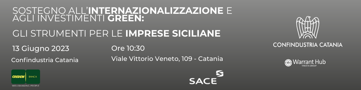 SACE e CREDITO EMILIANO mettono a disposizione delle PMI siciliane specifiche misure finalizzate a supportare i processi di internazionalizzazione, vincere la sfida della transizione ecologica, fronteggiare le problematiche del conflitto Russia – Ucraina. Il seminario, organizzato con Confindustria Catania, mira a presentare queste opportunità e a promuovere un confronto tra gli esperti presenti sul territorio e le società che si trovano ad aff rontare nuove sfide globali. Warrant Hub partecipa con un intervento dedicato di Marco Russo, Sales Consultant Area Sicilia. PROGRAMMA Saluti – Angelo Di Martino, Presidente Confindustria Catania Intervengono: Maria Luisa Miccolis, Director Sales PMI, SACE Chiara Pollicina, Relationship Manager Sales PMI Sud, SACE Michelangelo Guccione, Regional Manager, CREDEM Vincenzo Vito Tringali, Responsabile Commerciale Estero Sicilia e Calabria, CREDEM Marco Russo, Sales Consultant Area Sicilia, Warrant Hub Testimonianze aziendali