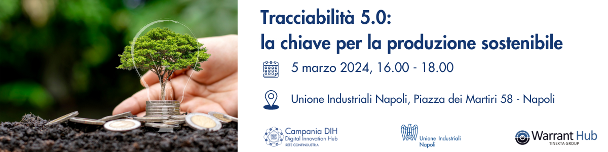 Essere tracciabili e sostenibili è diventato un imperativo per le aziende, specialmente alla luce delle nuove normative europee. L’implementazione del passaporto digitale sostenibile di prodotto è ora essenziale, fungendo da catalizzatore per l’adozione di pratiche che promuovono la trasparenza e la responsabilità lungo l’intera Supply Chain. L’evento dal titolo ” Tracciabilità 5.0: la chiave per la produzione sostenibile” , organizzato da Unione Industriali Napoli e con la partecipazione speciale di Pastificio Lucio Garofalo S.p.A. , si propone di esplorare il ruolo fondamentale della tracciabilità avanzata nella guida verso una produzione responsabile e sostenibile, abbracciando i principi della rivoluzione industriale 5.0. La produzione del futuro richiede una visione innovativa e integrata, in cui la tracciabilità 5.0 emerge come elemento chiave. Questo evento riunirà esperti e professionisti del settore per esplorare come la tracciabilità avanzata di prodotto, di processo ed energetica, guidata dalle tecnologie emergenti, possa essere implementata per supportare una produzione sostenibile. Agenda: SALUTI E INTRODUZIONE – Costanzo Jannotti Pecci, Presidente Unione Industriali Napoli; Edoardo Imperiale, CEO Campania DIH – Rete Confindustria Scarl e Coordinatore EDIH PRIDE INTERVENTI – Vincenzo Bo, Digital Supply Chain BU Director – Warrant Hub (Tinexta Group); Carlo Adalberto Moretti, Digital Technical Sales Director Europe BU Digital Supply Chain – Warrant Hub (Tinexta Group) ; Gianluca Messina, Area Manager Centro Sud Italia- Warrant Hub (Tinexta Group) BUSINESS CASE – Gianni Schisa, Direttore Operations – Pastificio Lucio Garofalo S.p.A. Modera Gaetano Amatruda, Responsabile Comunicazione – Campania DIH. Iscriviti all’evento, tracciamo insieme il percorso verso una produzione sostenibile e consapevole nel contesto della rivoluzione 5.0! ISCRIVITI